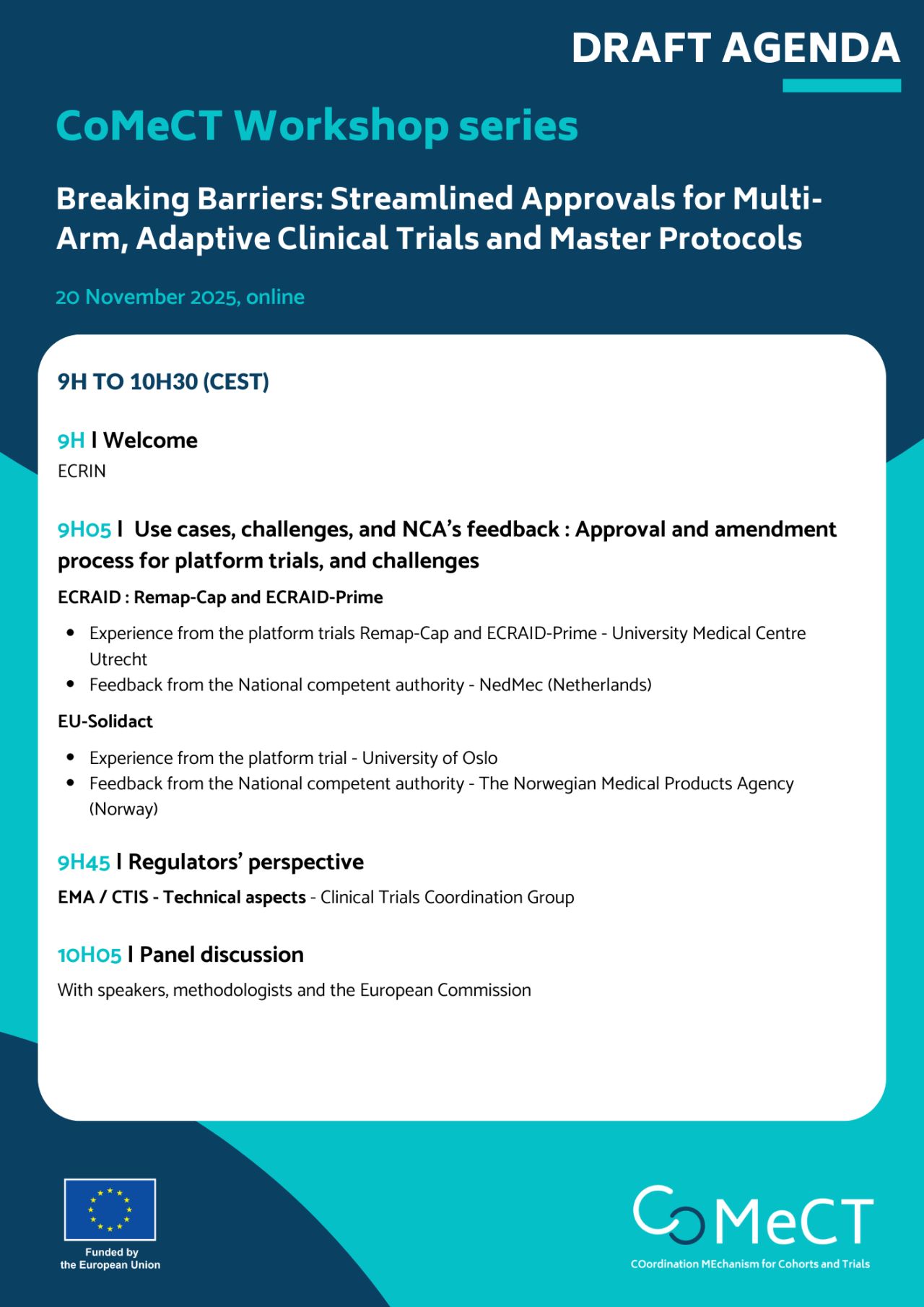 Hosted by CoMeCT partner ECRIN (European Clinical Research Infrastructure Network), and joined by leading experts and regulators, this workshop will focus on making approval processes smoother, faster, and more efficient for innovative, adaptive trial designs.